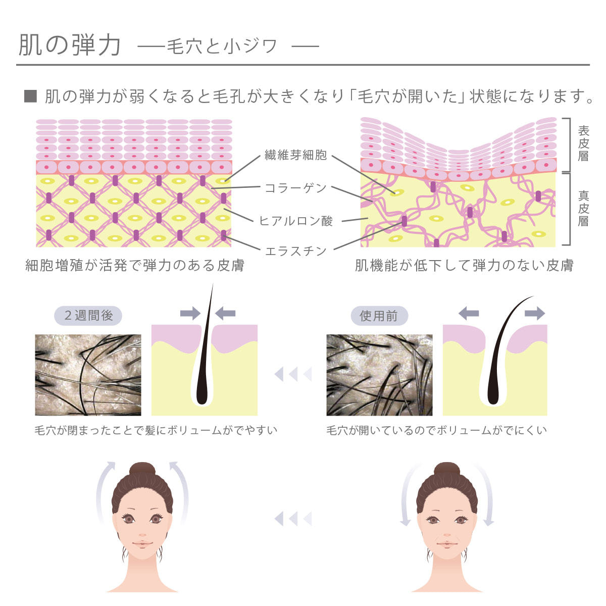 浸透性の高い生コラーゲンを配合することにより、髪と頭皮にうるおいを与え、ハリと弾力のある髪を作ります。